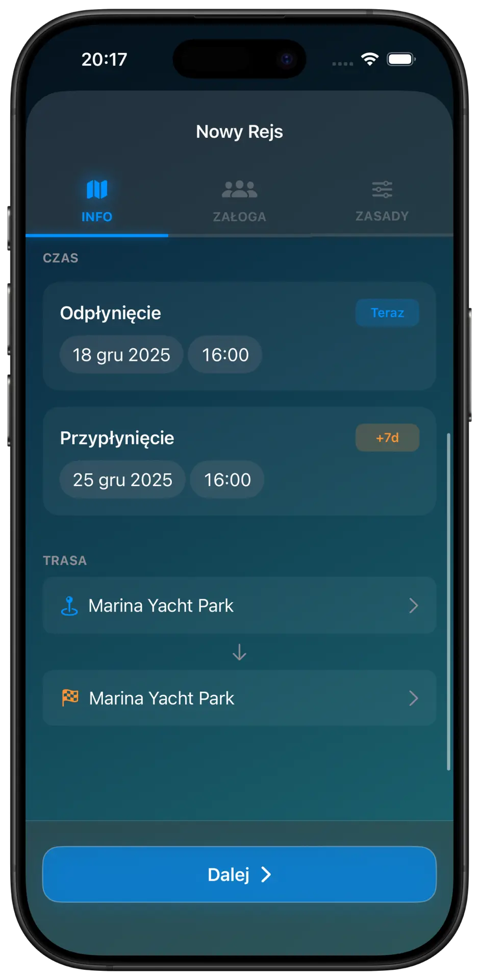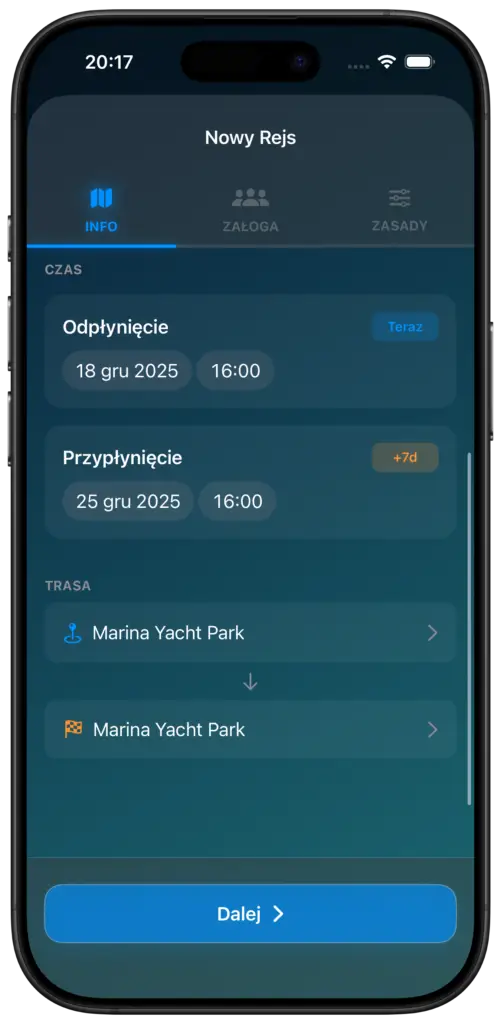 Nazwij rejs: Wpisz nazwę, która będzie widoczna dla całej załogi (np. „Chorwacja 2025”).
