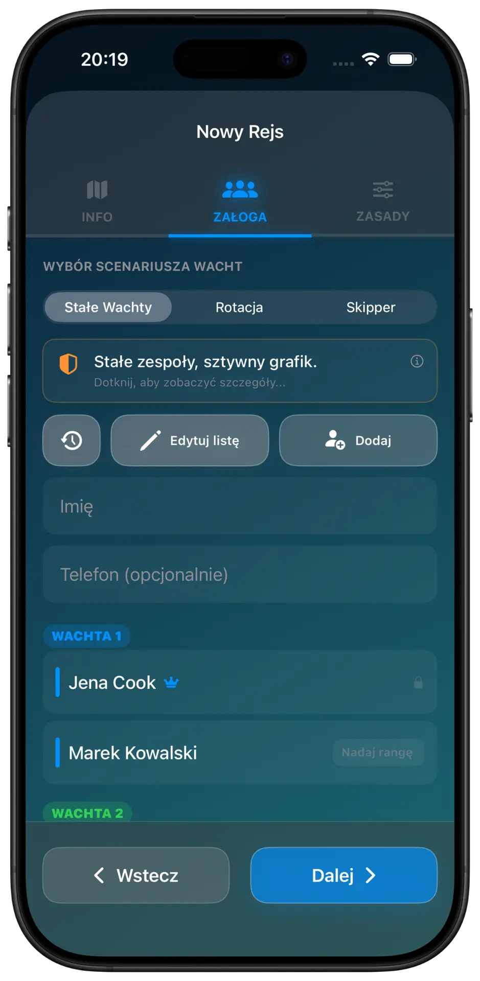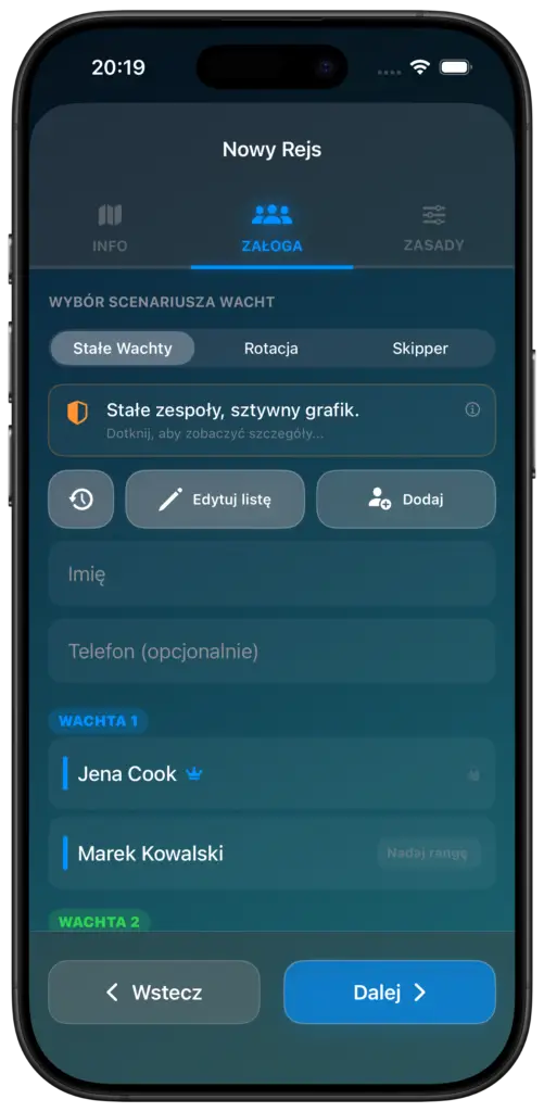 Jak to działa: Aplikacja dzieli listę załogi na sztywne grupy (np. Wachta 1, Wachta 2) w kolejności z listy.