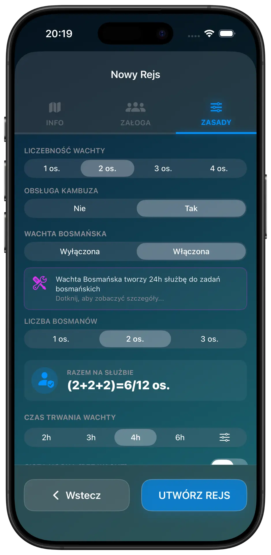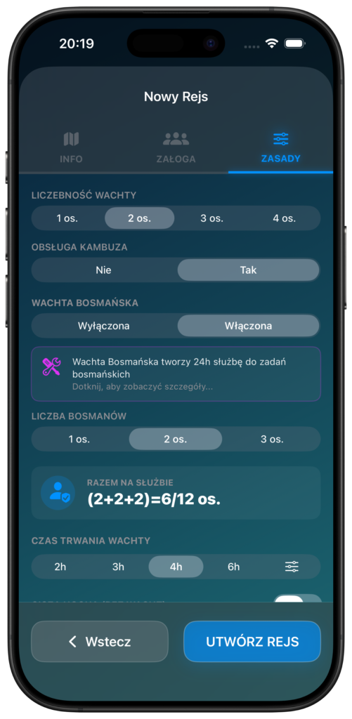 Czas trwania: Wybierz długość pojedynczej wachty (np. 3h, 4h) lub ustaw własny czas (dostępne w PRO).