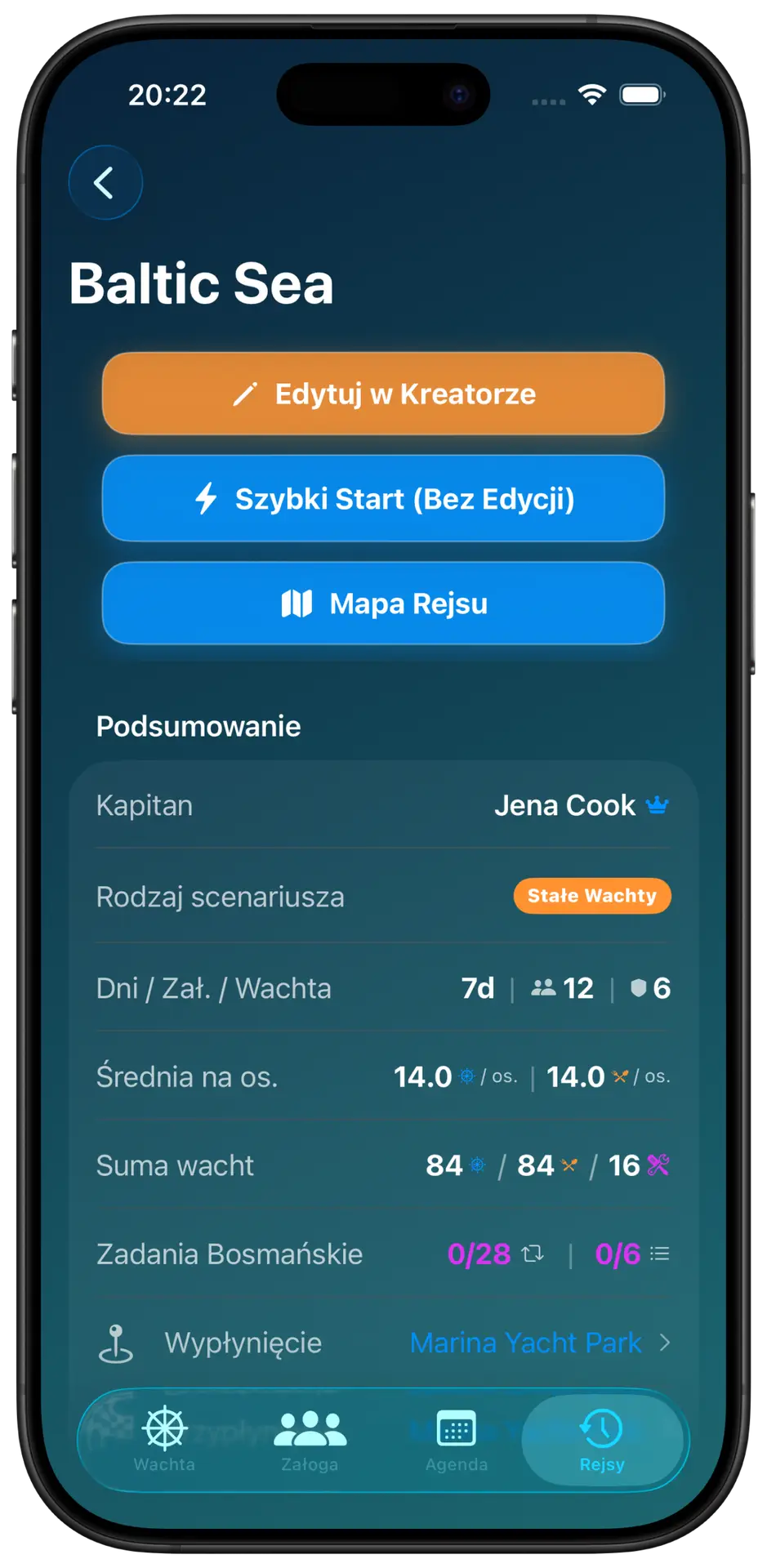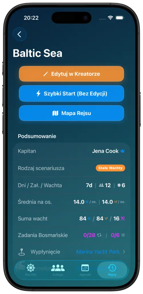 Plik zawiera pełne dane rejsu: listę załogi, zadania bosmańskie, harmonogram wacht oraz statystyki.
