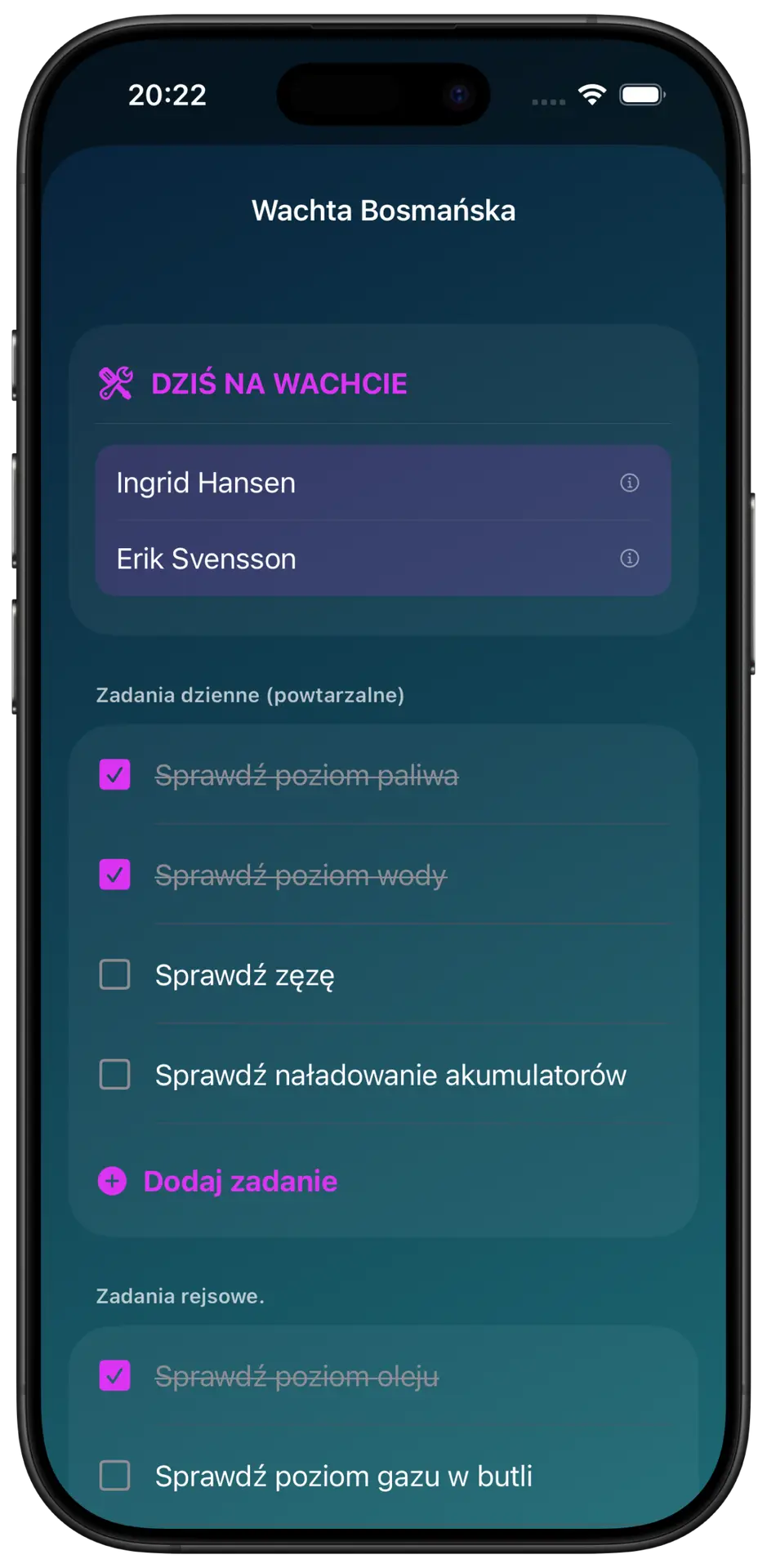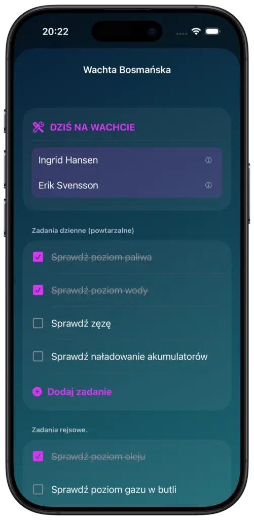 Zadania Codzienne: Powtarzalne czynności, które „resetują się” każdego dnia (np. sprawdzenie poziomu wody, paliwa, napięcia akumulatorów, sprawdzenie zęzy).