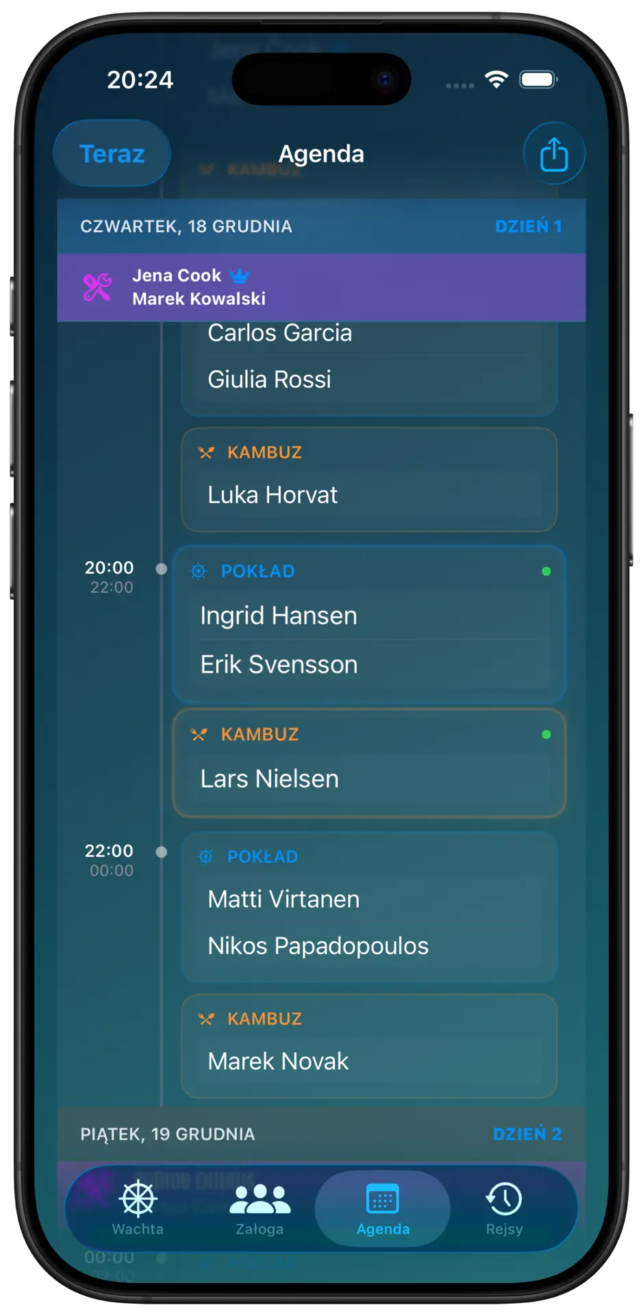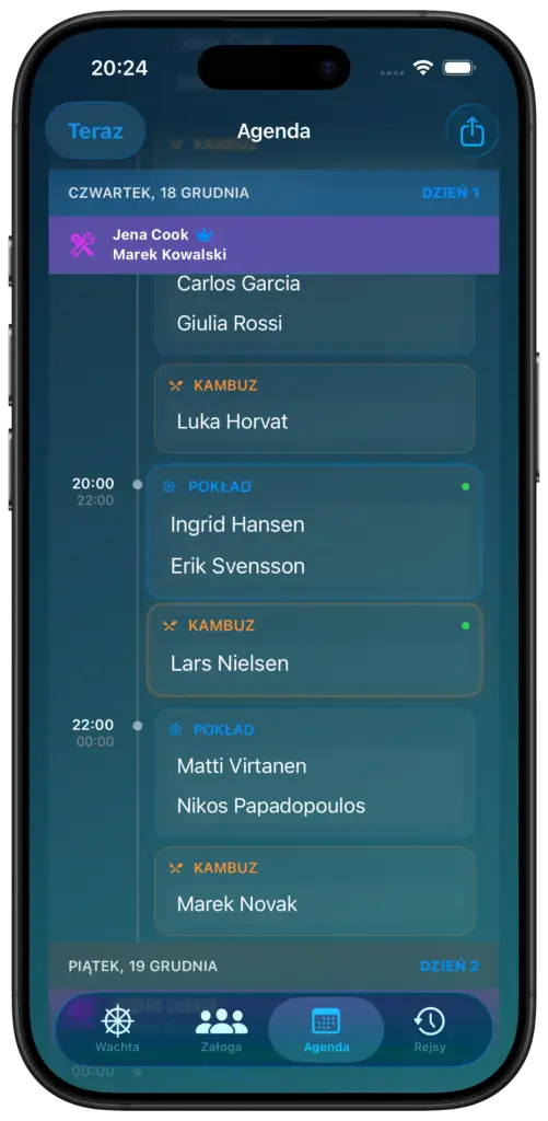 Jednym kliknięciem wygeneruj pełną listę załogi (Crew List) oraz harmonogram wacht, gotowe do druku i powieszenia w messie.