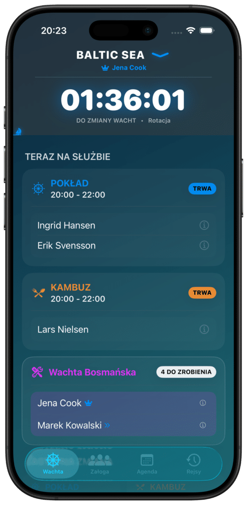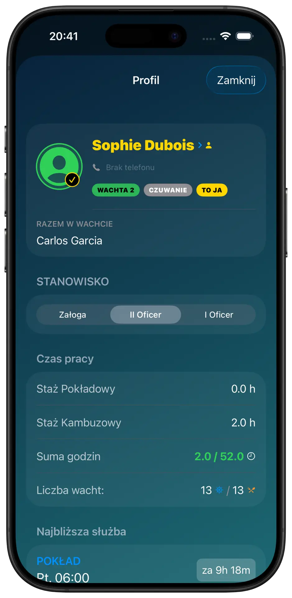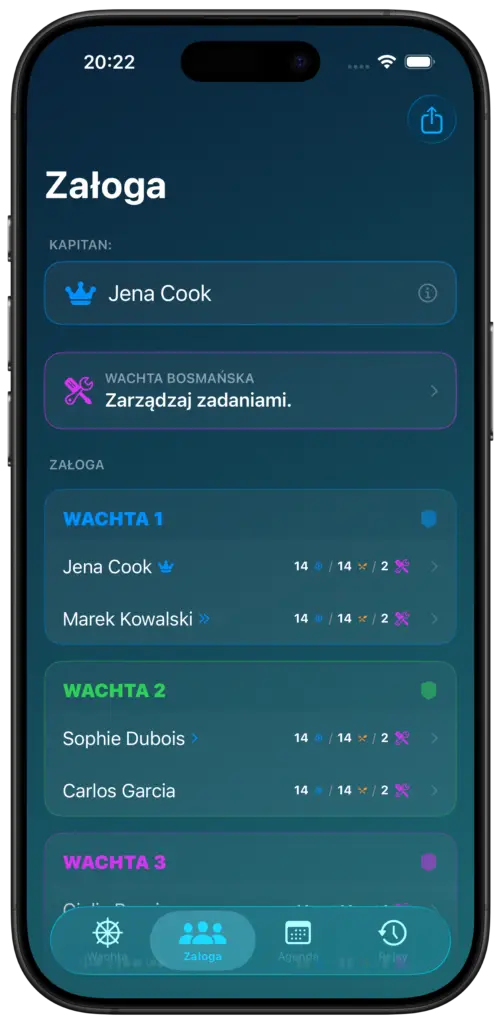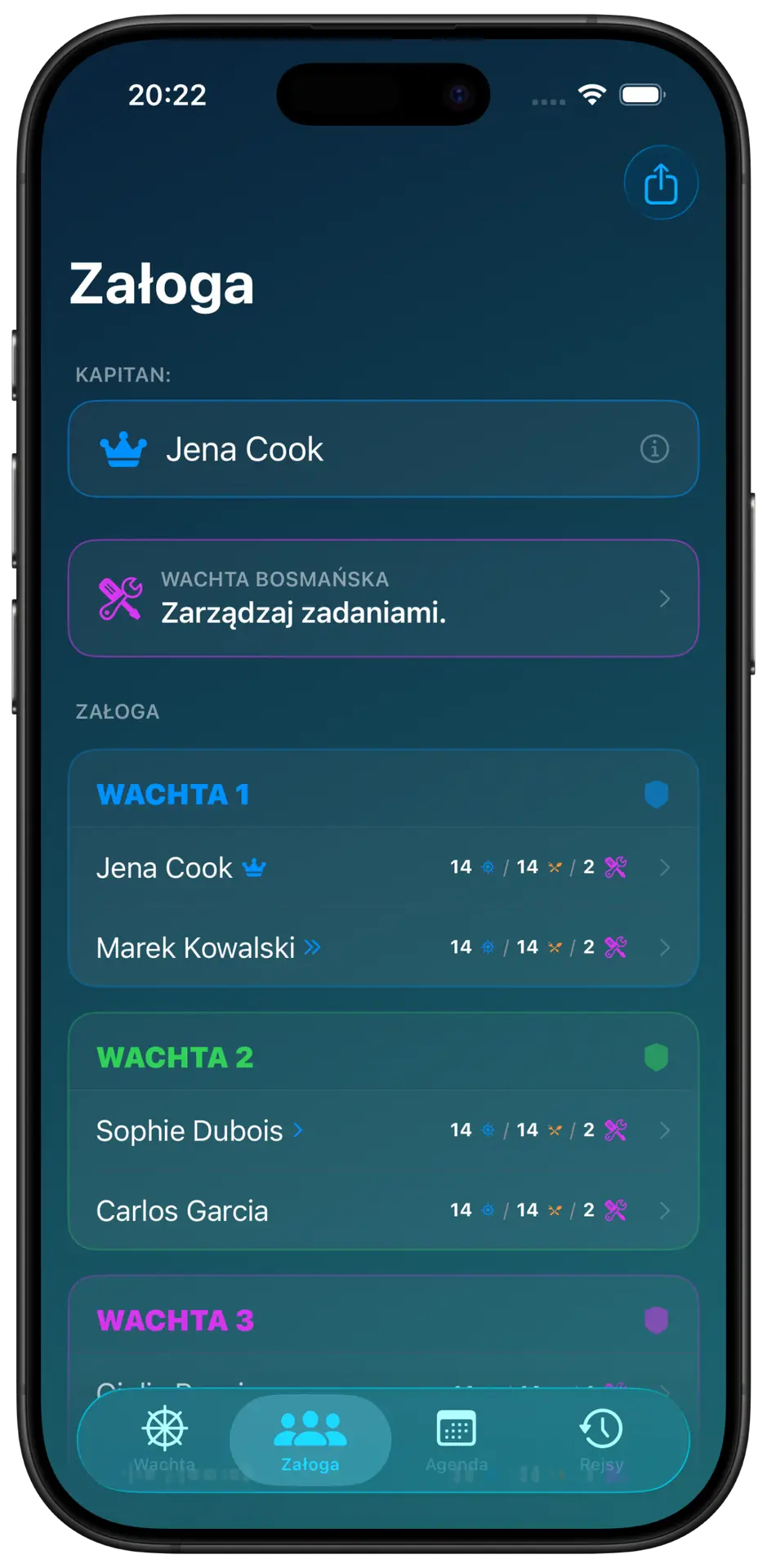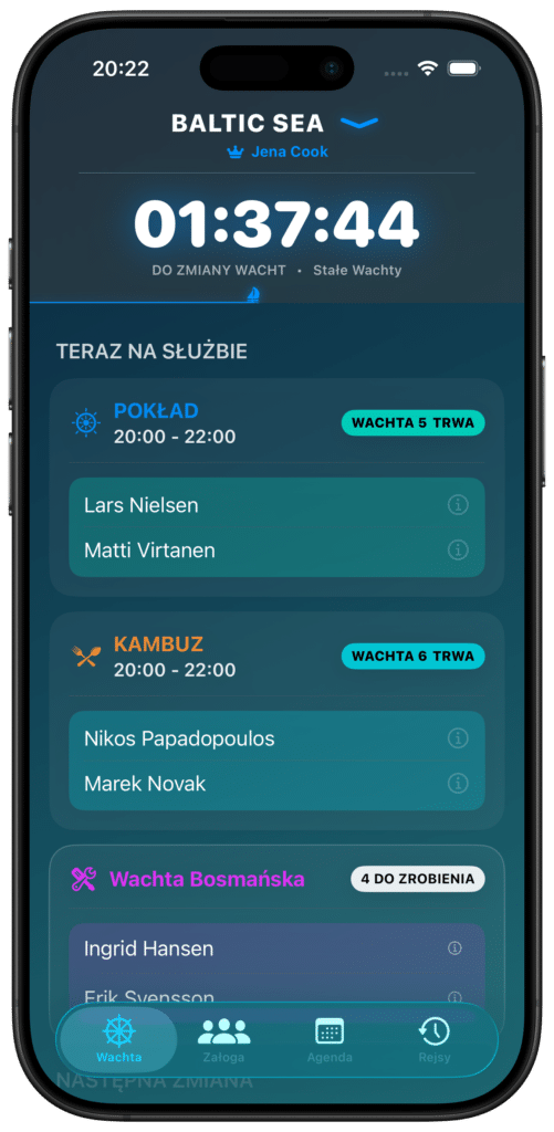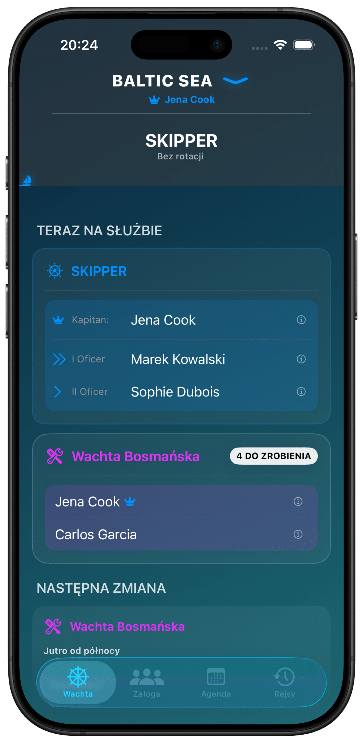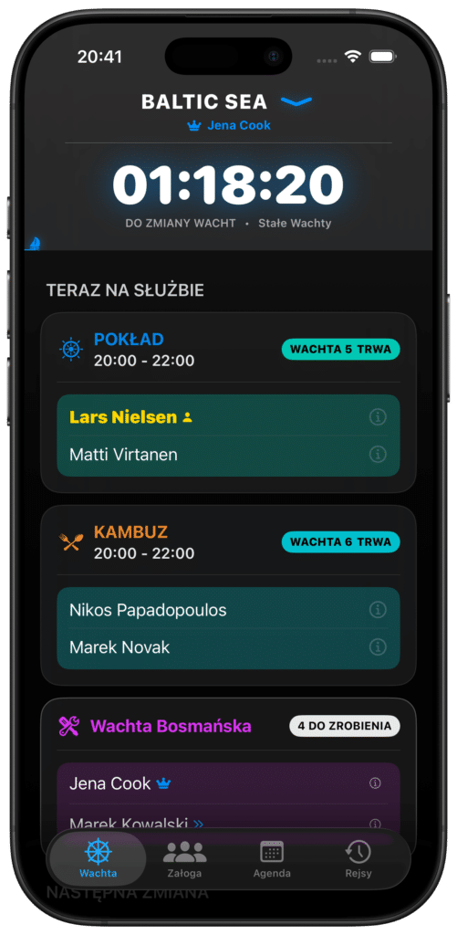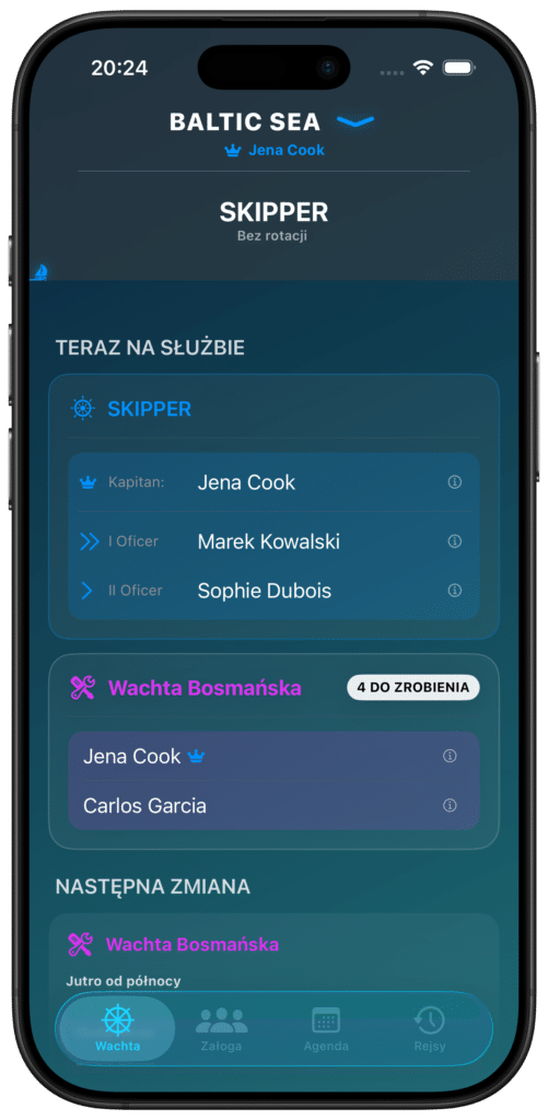 Wachty to pierwsza aplikacja, która rozumie, kim jesteś na pokładzie. Dzięki funkcji „To Ja” wskazujesz swój profil na liście załogi, a aplikacja personalizuje całe doświadczenie: